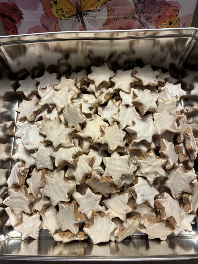 Zimtsterne Zutaten:Für den Teig:400 g gemahlene Mandel250 g Puderzucker1 Teelöffel gemahlener Zimt2 Eiweiß2 Eßlöffel Amaretto1 Pck Vanillezuckeretwas Weizenmehl zur TeigverarbeitungFür die Baiser-Schicht125 g Puderzucker1 Eiweiß Zubereitung: